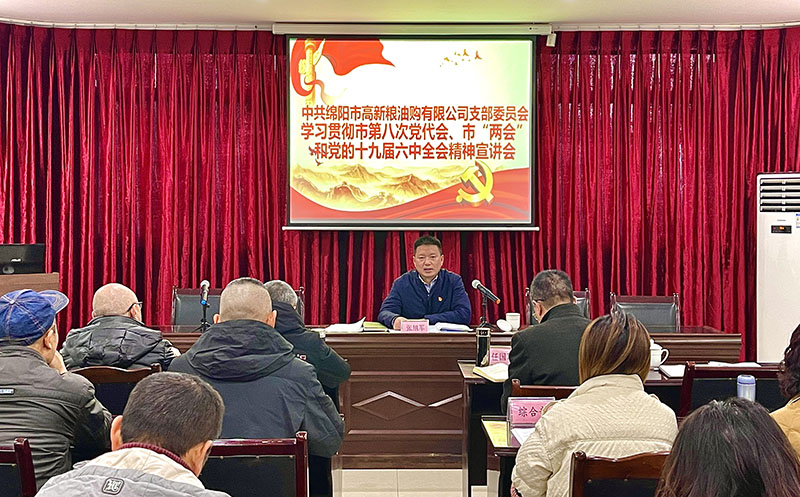 为进一步推动党的十九届六中全会、市第八次党代会及市第八届人民代表大会第一次会议、市政协八届一次会议精神在集团学习贯彻走深走实,11月26日上午,集团党委书记、董事长张旭军到市高新粮油购销有限公司党支部作深入学习贯彻党的十九届六中全会和绵阳市第八次党代会及“两会”精神专题宣讲。