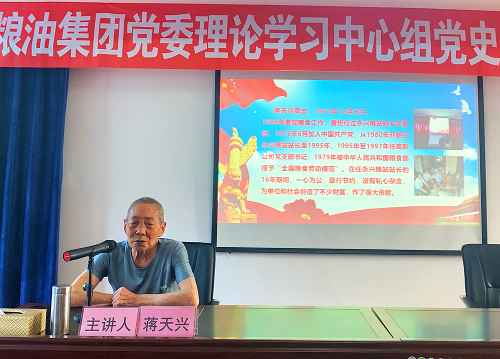 原绵阳市高新区良友贸易公司(现市高新粮油购销有限公司)党支部书记、曾荣获原国家粮食部授予的“全国粮食劳动模范”称号的蒋天兴老同志, 1976年加入中国共产党,现已八十高龄,他自1966年参加粮食工作以来,曾先后担任过驻乡农管员、付款员、司称员、会计员以及粮站站长等多个职务。蒋天兴同志爱岗敬业,拼搏实干,在每个岗位上都积极争创一流,练就了一身过硬的本领;他淡泊名利,甘于奉献,为粮油事业发展竭尽心力,为企业和社会作出了突出贡献。党课中,他认真回顾了改革开放以来粮食企业的发展历程,质朴分享了自己几十年来慎终如始做好储粮保粮工作,吃苦耐劳,无私奉献的先进事迹。他殷切寄语在座人员,要树立正确的“三观”,正确看待苦乐、得失、成败,全心全意为人民服务;要不忘初心、牢记使命,强化对党赤诚的心、对工作敬业的心、对同事团结的心,切实为企业、为群众办实事。