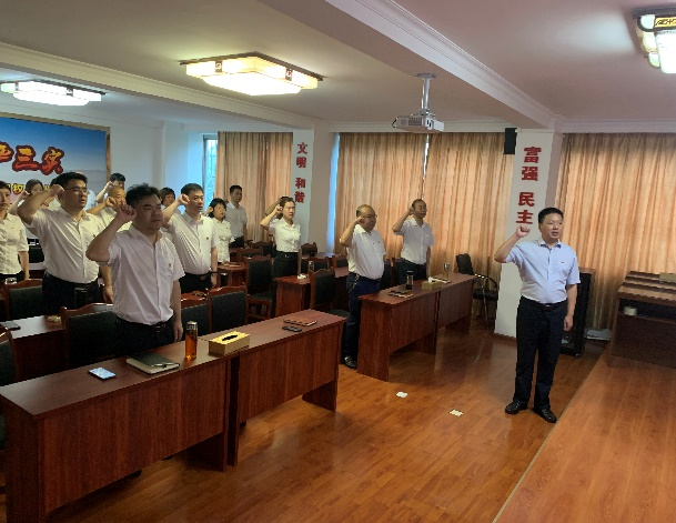 “我志愿加入中国共产党,拥护党的纲领,遵守党的章程......”直播开始前,集团全体党员在各党组织负责同志的带领下,整齐列队,庄严地举起右手,面向党旗重温入党誓词,铿锵有力的誓言鞭策着大家永葆入党初心、不懈砥砺前行。