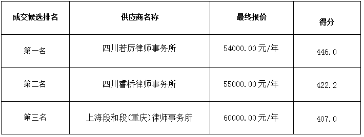 根据绵粮国际贸易(绵阳)有限公司涉外法律顾问服务(第二次)(采购项目编号:MLGJ(2024)01-1)竞争性磋商文件要求,评标小组于2024年10月21日下午15:00在绵粮国际贸易(绵阳)有限公司会议室对涉外法律顾问服务(第二次)进行竞争性磋商。至递交磋商文件截止时间,共6家单位递交响应文件,其中通过符合性审查的单位3家,未通过符合性审查的单位3家。评审小组对通过符合性审查的竞标人进行磋商,以得分从高到低推荐一至三名成交候选人。