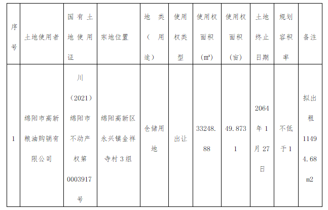 绵阳市高新粮油购销有限公司将于2022年2月13日10时止在绵阳市高新粮油购销有限公司对位于绵阳高新区永兴镇金祥寺村3组的仓储用地,拟出租面积为11494.68 m2 。进行现场竞价招租,现就招租有关事宜敬告各位潜在承租商: