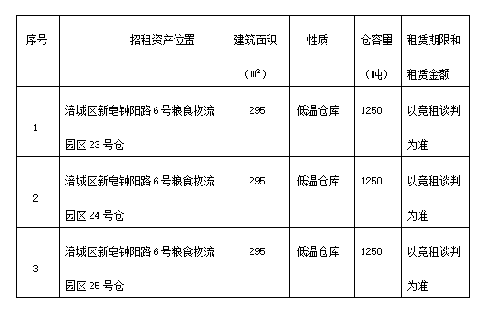 绵阳市军粮供应有限公司现将位于涪城区新皂钟阳路6号粮食物流园区内的23、24、25号低温仓库面向社会进行公开招租,现将有关事宜公告如下: