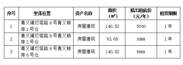 绵阳市储备粮管理有限公司现将青义粮库完好的、未使用1、2、6号仓库,建筑面积为374.72㎡(其中:1号仓库建筑面积为140.52㎡;2号仓库建筑面积为93.68㎡;6号仓库建筑面积为140.52㎡)面向社会进行公开招租,有关事宜公告如下: