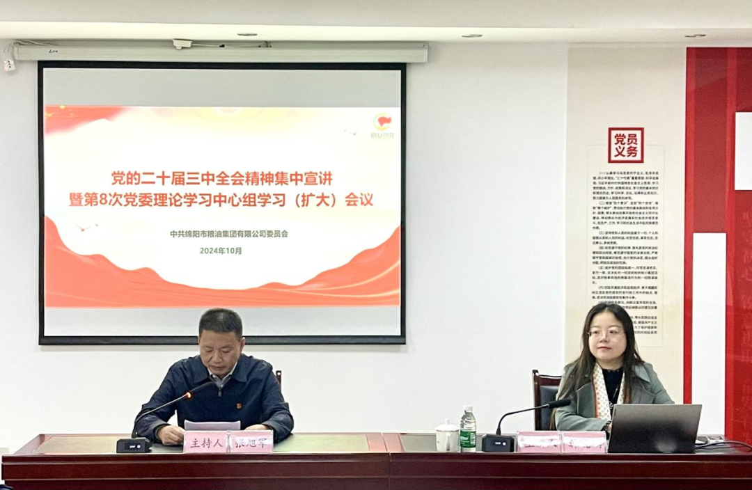 10月31日,市粮油集团党委组织召开学习贯彻党的二十届三中全会精神集中宣讲暨第8次理论学习中心组学习(扩大)会。集团党委书记、董事长张旭军主持会议,党委班子成员出席会议。会议邀请了市国资委二级调研员刘弢同志出席并指导会议。