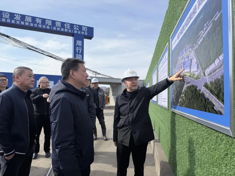 张旭军一行实地参观了穗丰粮油集团高标准粮仓建设项目,详细了解了项目整体规划、功能定位、资金筹措及建设进展等情况,对项目的科学规划和规范管理给予高度评价。