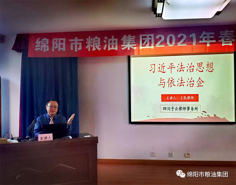 为深入学习贯彻习近平法治思想,提高集团公司依法治企水平,防范企业法律风险,进一步增强员工遵纪守法意识,5月10日,集团公司组织开展了春季法治专题讲座,邀请绵阳市律师行业党委副书记、四川子云律师事务所主任王凯律师作《习近平法治思想与依法治企》法治专题讲座。集团公司纪委书记张映海主持讲座,集团公司班子成员、集团本部全体员工、营销中心、各子(分)公司中层以上干部共计70余人参加讲座。